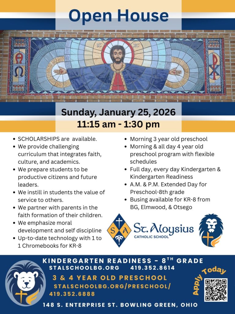 Open House is Sunday, January 25, 2026 11:15 am – 1:30 pm. Tours can also be requested. Students in grades 2 and up are also able to shadow a current student during the school year. Parents may call the school office for details at 419.352.8614.